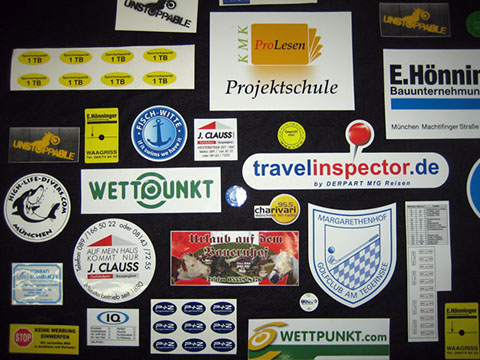Wir bedrucken im Digital- oder Siebdruck kostengünstige Folienaufkleber, Etiketten, Prüfplaketten Siegelplomben und Inventar-Aufkleber. Letztere nach Wunsch auch mit fortlaufender Nummer. Alle Aufkleber können einzeln oder in Serie, in verschiedensten Formen (Wappenform, rund, oval oder eckig) und unterschiedlichsten Folientypen hergestellt werden. Falls Sie Unterstützung bei der Gestaltung brauchen, stehen wir Ihnen gerne zur Verfügung. Größere Aufkleber können wir für Sie fachgerecht verkleben.