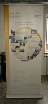 Roll–Up Bussiness mit stabilem Aluminiumgehäuse. Das Banner wird oben mit einer Klemmleiste befestigt und unten im Gehäuse fest verklebt.